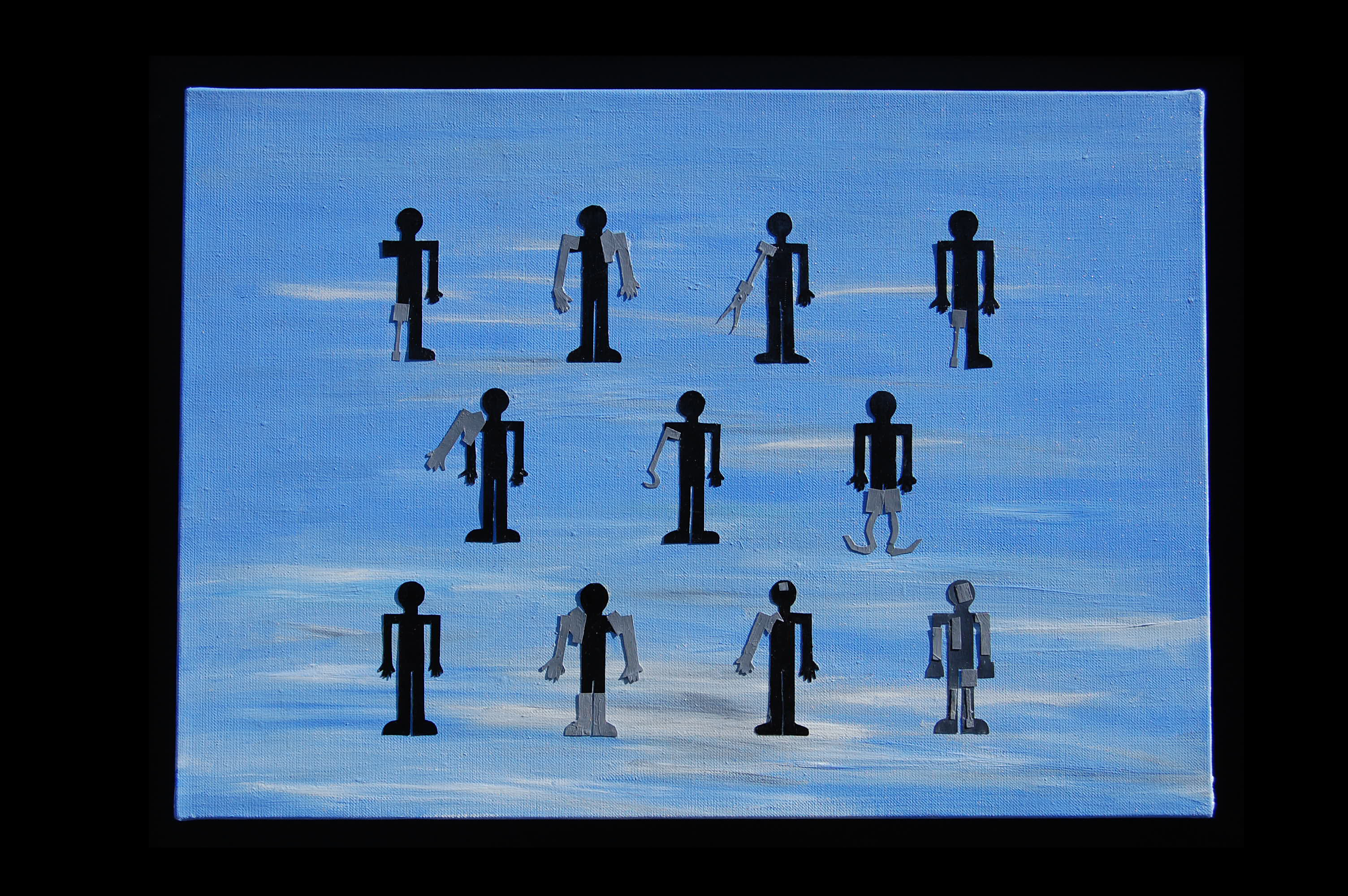 The matter in this painting was to express with a given group of individuals, eleven players on the field, lost limbs and reconstructed ones, following the range of possibilities plastic surgery practices offer: mechanical, myoelectrical, functional and/or aesthetical and bionic. The last “player” thanks to his numerous enhancements has already become a hybrid body, of which we don’t know anymore what is part of the human and what is part of the machine.